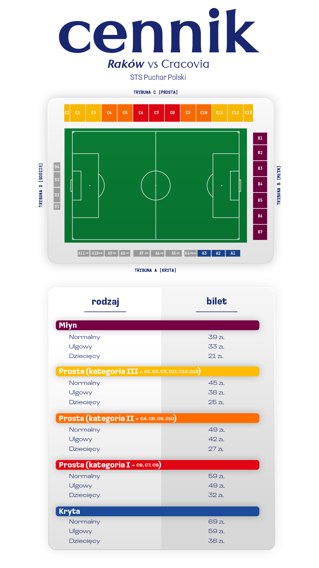 Bilety na trybunę A, B oraz C będą do nabycia w Raków FanStore przy Limanowskiego 83 oraz w Galerii Jurajskiej, a także online TUTAJ oraz w kasach stadionu (18 i 19 października). Wejściówki na trybunę B będą do nabycia również w sklepie kibica MEDALIK przy alei Kościuszki 18/20, C.H. "Jagiellończycy" oraz Limanowskiego 83. Szczegóły znajdziecie na profilu Stowarzyszenia Kibiców "Wieczny Raków" - TUTAJ.